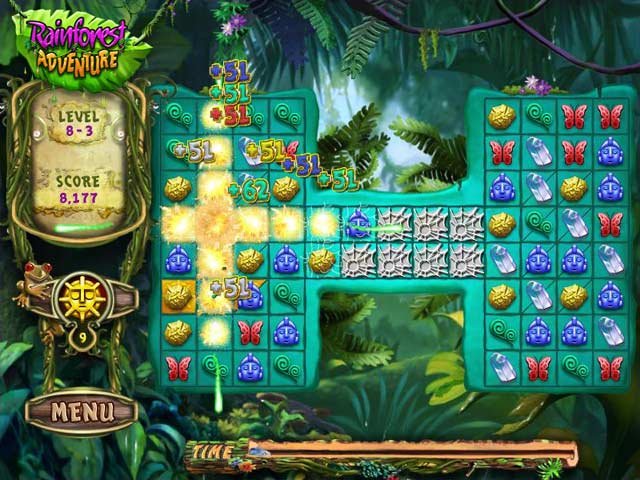 Rainforest Adventure is een simpele 3 Match game, waarbij je 3 of 4 of 5 tegels van dezelfde soort moet combineren. Als je dit doet verdwijnen de gecombineerde tegels en veranderen de vakjes waar de tegels eerst lagen in goud. Natuurlijk zijn er ook allemaal power-ups te verdienen. Ik hou van de levels tussen elk hoofdstuk. Dat zijn namelijk bonus levels waarbij je power-ups kan verdienen. Ik had niet zo lang nodig om dit spel uit te spelen, maar ik heb er wel van genoten. Het is een simpel spel, maar dat maakt het juist leuk. Er zijn in deze game Shines te verdienen, waarmee je zelf een vakje mag kiezen wat goud word gemaakt. Dit kan je soms uit de Puree helpen. Puree! Gadver, puree is altijd vies. Ik weet eigenlijk niets meer te vertellen, maar het is tot nu toe zo'n korte tekst.......... Weetjes! - - -Rainforest betekend Regenwoud in het Engels... Wow, dat wist je nog niet... Nou, eigenlijk wel.
